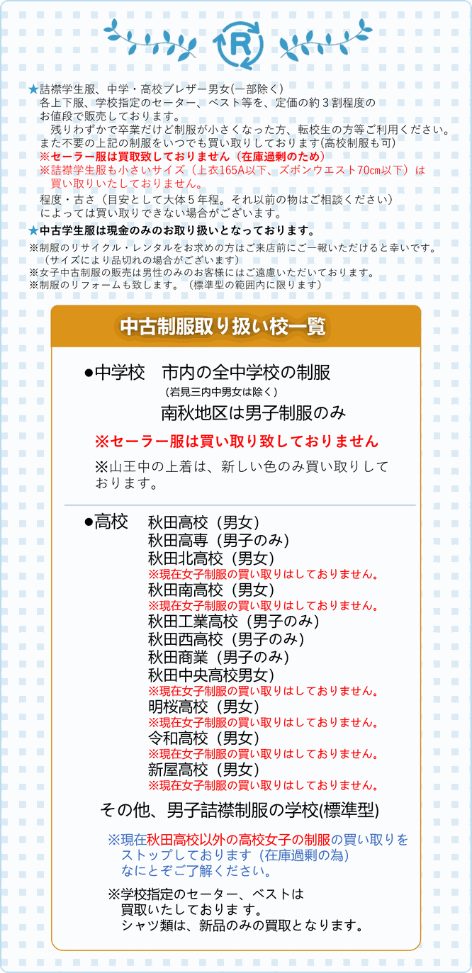 ※リユース制服のお支払いは現金でお願いいたしております。何卒ご了承ください。